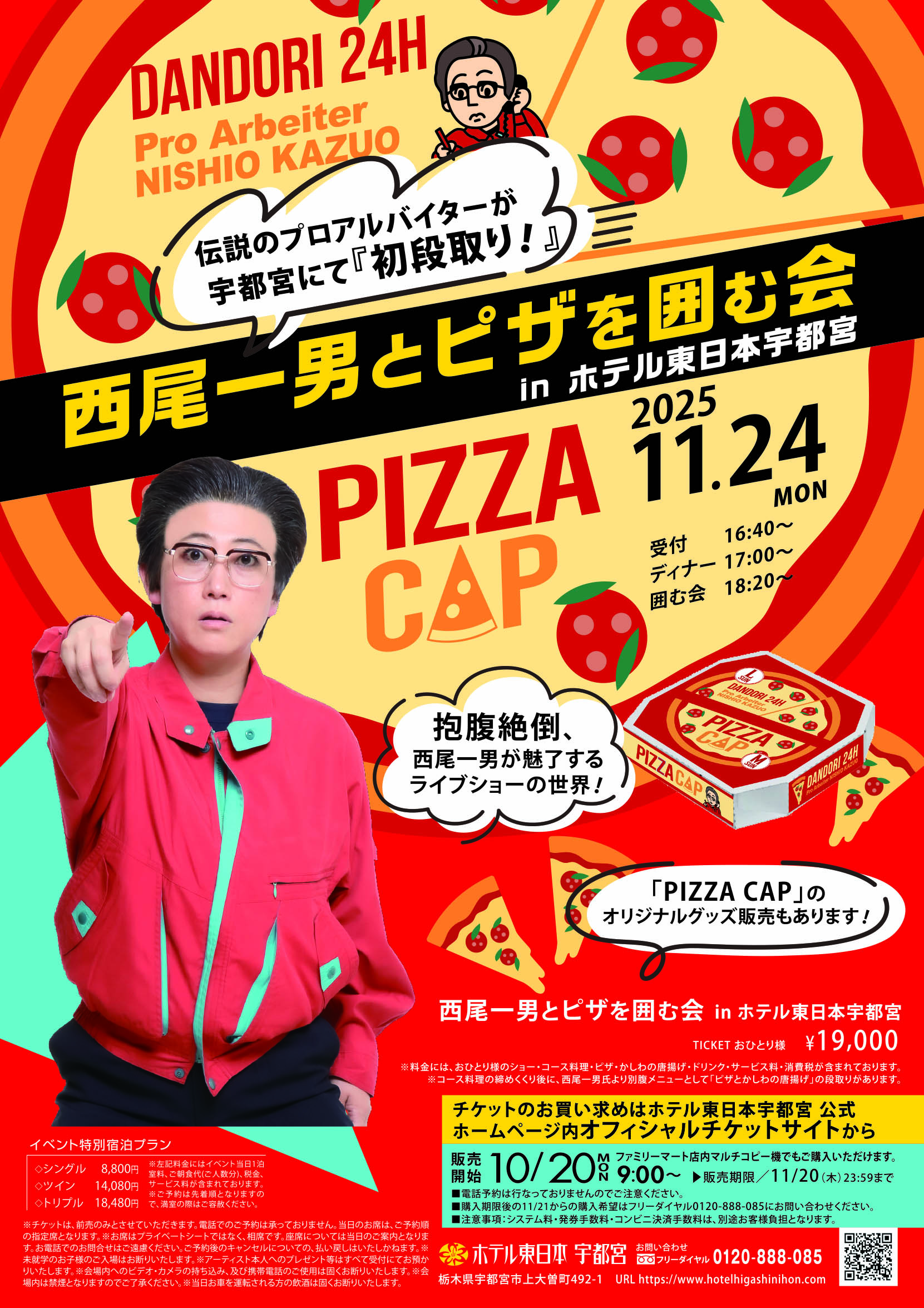 ※料金は、お一人様のショー・コース料理・ピザ・かしわの唐揚げ・ドリンク・サービス料・消費税が含まれております。※コース料理の締めくくり後に、西尾一男氏より別腹メニューとして「ピザとかしわのから揚げ」の段取りがあります。