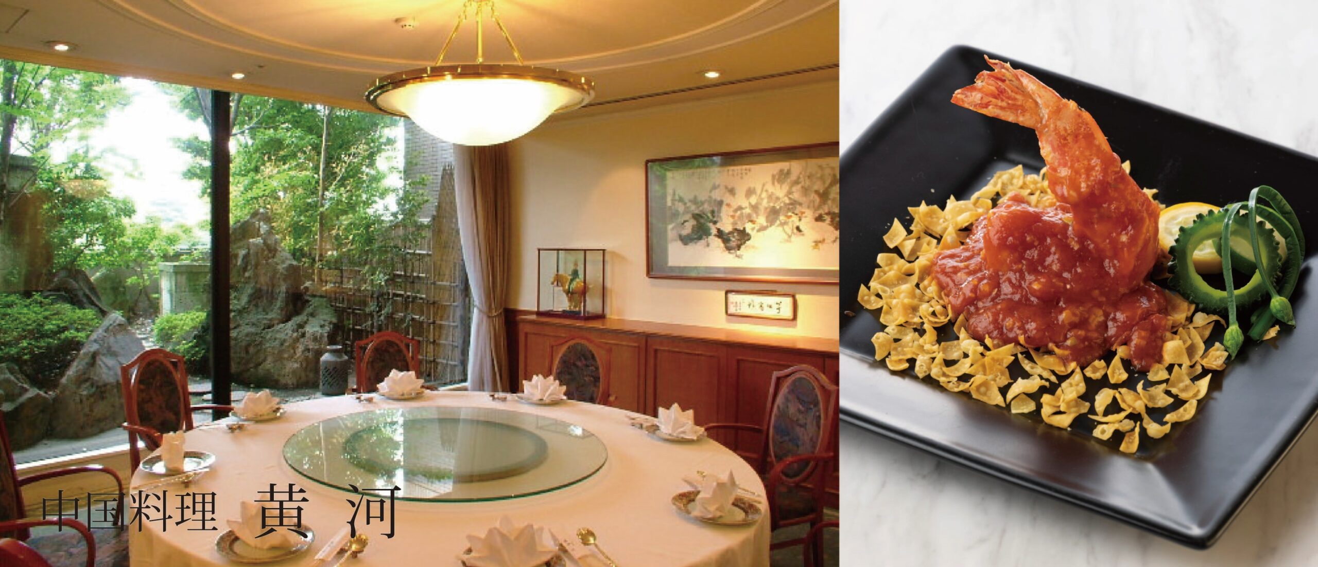 さまざまなご主旨に合わせて利用しやすい中国料理「黄河」。各個室の窓ガラスから日本庭園をのぞむことができ、