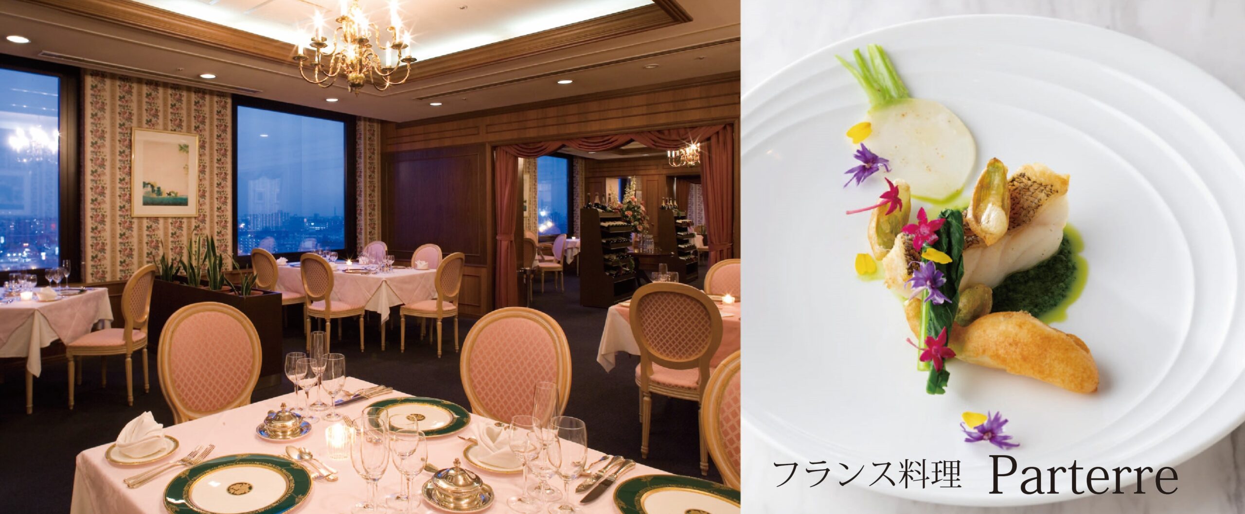 最上階からの眺望と旬の食材をとりいれた芸術的なフレンチがおたのしみいただける「パルテール」。