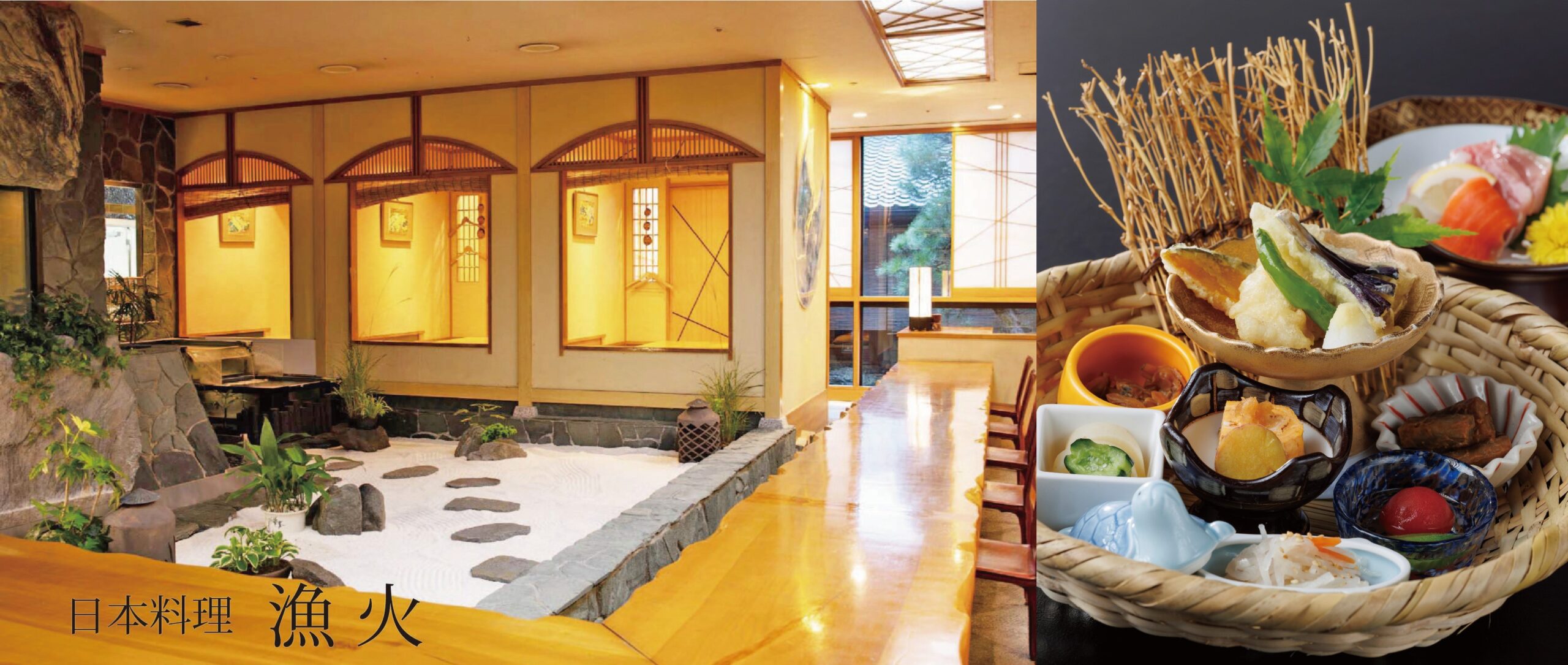 癒しの屋内庭園を囲みながら、海の幸、山の幸を堪能できる日本料理「漁火」。