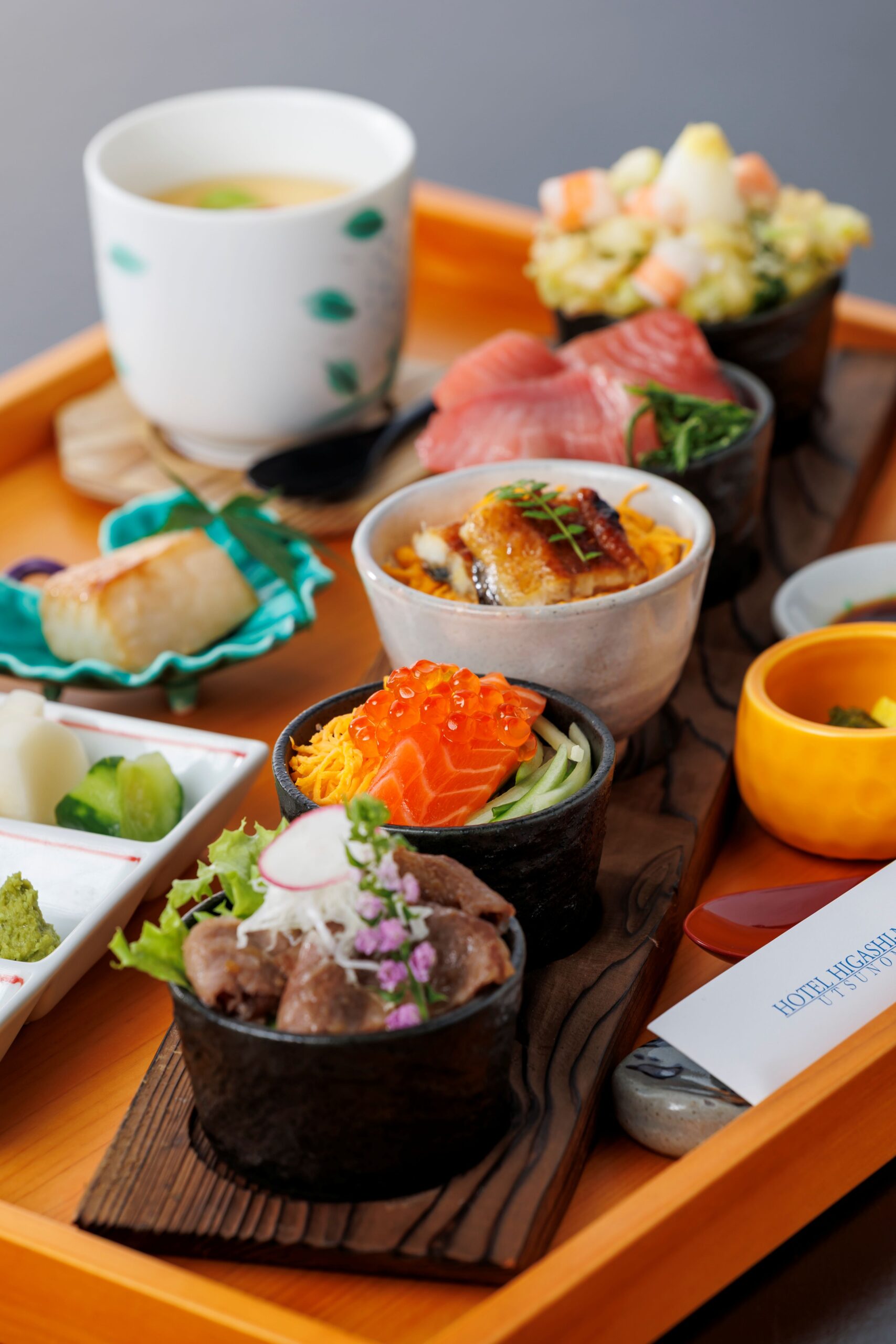 桧のトレーにのせた鮮やかなミニ丼5種を一度に味わえる、平日限定ランチを是非おたのしみください。